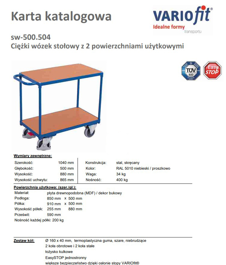 Wózek półkowy z uchwytem, do 400 kg, 2 półki, 88 x 104 x 50 cm, niebieski |